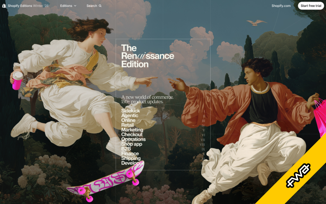 Shopify's Winter ’26 Edition features 150+ product updates for a new world of commerce. Updates are beautifully set against the backdrop of 3D paintings that mix Renaissance art with modern elements.